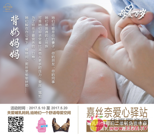 5月10日,嘉丝奈五月系列活动之“给37℃母爱一点空间”在嘉丝奈微信公众平台推出。作为象征女性美丽和健康的代表品牌,嘉丝奈一直关注“背奶妈妈”“地铁妈妈”这种既特殊又伟大群体,希望通过更多的渠道和方式让社会上越来越多的人去深入了解哺乳妈妈的艰辛和大爱,给她们提供更多理解和支持。