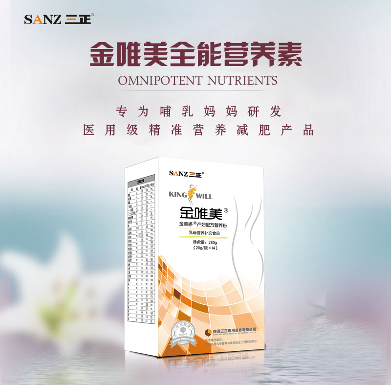金唯美—专为中国哺乳妈妈研制的医用级精准全能营养素,是由陕西三正医用营养有限公司联合中国营养学会、西安交通大学,根据中国营养学会推荐的《中国居民膳食营养素参考摄入量》(DRIs)及孕妇及乳母营养补充食品国家标准》GB31601-2015,由全国数十位著名妇产科专家及营养学专家,专门针对中国哺乳妈妈量身订制,精准量化哺乳期宝宝的营养需求,精心研发的一款专业医用级全营养素,确保宝宝充足营养的同时,不产生妈妈的营养过剩,需要多少补多少,防止脂肪堆积过度肥胖,填补了国内这一领域的空白!得到了全国数十万哺乳妈妈和临床医生、护士的广泛认可和好评!