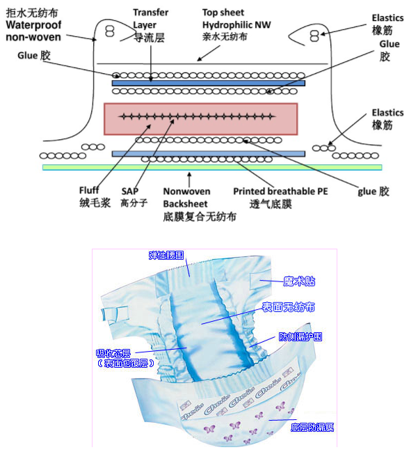 纸尿裤一般由三个主要部分组成,即内表层、吸收芯层和底布。内表层直接接触宝宝皮肤,既要求绵柔不伤皮肤又要求干爽,目前国内市场上的纸尿裤基本上是无纺布面层,透气无纺布能提升尿裤内部的透气程度。吸收芯层是整块纸尿裤运作的核心,能快速吸收尿液、分散尿液或能通过毛细作用把它扩散到整个芯层中、最终吸收并储存尿液。纸尿裤的吸收芯层主要由纯木浆(绒毛浆)和高分子吸水树脂(SAP)构成的层状结构。底布就是外面包裹纸尿裤、有图案那层了,底布材料一般为PE透气膜或无纺布,无纺布感觉更为舒适。