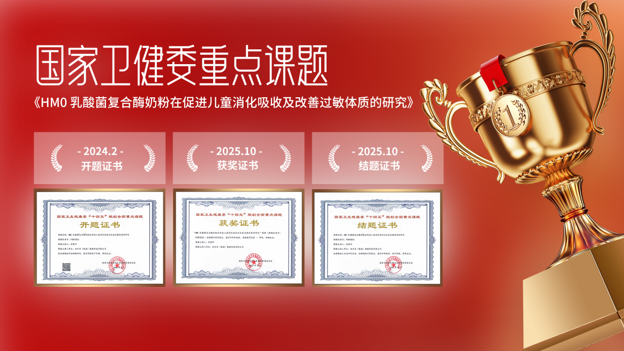 力个高(Lekiko)联合研究的《HMO乳酸菌复合酶奶粉在促进儿童消化吸收及改善过敏体质的研究》,入选国家卫健委“十四五”规划全国重点课题,并荣获科研成果一等奖。这不仅是荣誉,更是对我们科研路径与长期价值的权威验证。