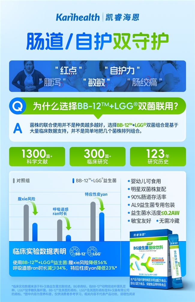 据2025年发布的《中国儿童急性感染性腹泻临床实践指南》中明确指出:益生菌治疗儿童急性感染性腹泻有效,且在早期使用益生菌疗效更佳。作为深耕婴童营养领域16年的专业品牌,凯睿海恩旗下产品BG益生菌,凭借“黄金双菌组合、低敏配方、高活性保障”三大核心优势,为儿童肠胃健康提供了科学解决方案,在同质化市场中脱颖而出。